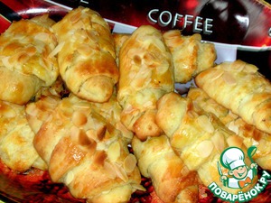 Верх каждого круассана смазала яйцом и посыпала миндальными лепестками. Поставила выпекаться в разогретую духовку 180 гр. в на 20 минут.