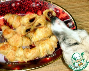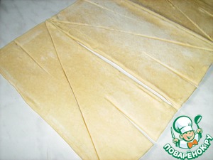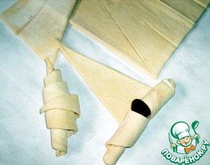 А это слоёное тесто. Разделила его на 5 частей. Каждую часть разрезала на два треугольника.