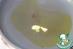 На сковороде с толстым дном хорошо разогрела оливковое масло, и кинула в него зубчик чеснока, предварительно его раздавив ножом