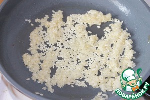 Чеснок выкинула, засыпала рис и спассеровала его на медленном огне до прозрачности