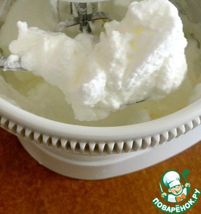 Белки взбить в густую пену. Тонкой струйкой, не переставая взбивать, вливаем горячий сироп. Продолжаем взбивать до тех пор, пока белки не будут устойчиво держаться на венчике. -