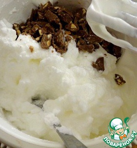 Отдельно взобьём охлаждённые сливки до мягких пиков и аккуратно вмешаем в белки.