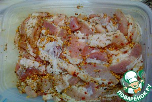 Мясо заранее маринуем в смеси сухой и дижонской горчиц