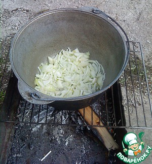Разогреваем масло и обжариваем в нём лук, до мягкости