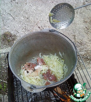 Добавляем бекон и даём жирку потечь и пропитать лучёк