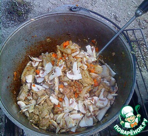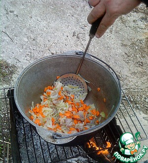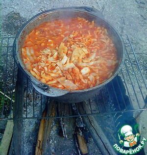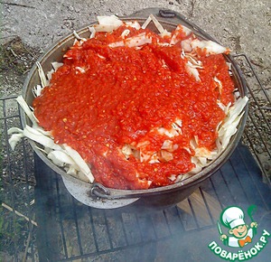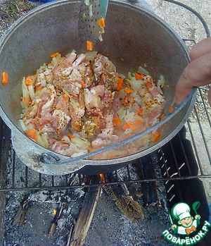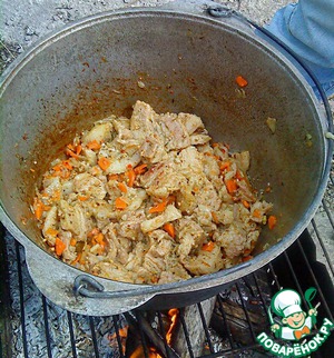 Рецепт был почерпнут из кулинарной програмы с Серджем Марковичем на канале "Охота и рыбалка". Первый раз готовили дома в кастрюле, решили перенести на мангал.