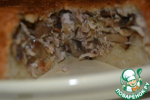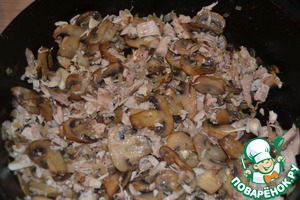 4. Приготавливаем начинку для пирога : режем шампиньоны и отправляем на сковородку, обжариваем почти до окончательной готовности и добавляем нарезанный мелко кубиками репчатый лук, размешиваем и обжариваем вместе с грибами. Отделяем курицу от кости нарезаем и добавляем к луку и грибам чуть обжариваем и выключаем, начинка готова.