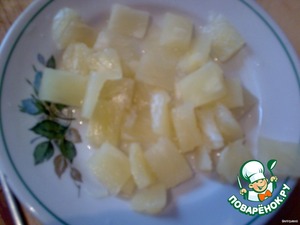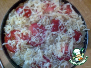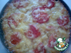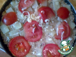 Выложить фарш в форму, смазанную маслом и посыпанную сухарями. Сверху разложить кусочки ананасов и кружки помидоров.