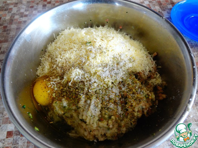 Добавить ту да же яйцо, сыр пармезан ( по рецепту надо бы сыр пекорино, но у меня не было), щепотку сухого орегано, соль. перец по вкусу и замоченные в молоке хлебные крошки ( вот я заметила, что итальянки почему-то кладут в фарш именно крошки а не чёрствую мякоть белого хлеба, как мы).