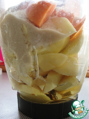 Наливаем в блендер полсакана растительного масла, чистим и режем яблоки, отправляем туда же, следом идет тем же путем морковь, кожура четверти апельсина и высыпаем стакан коричневого сахара ТМ "Мистраль". Все перемалываем, затем добавляем 1 стакан риса и перемалываем еще чуть-чуть.
