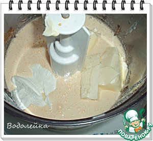 • Добавляем размягченное сливочное масло, сметану. Хорошо взбиваем.