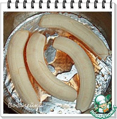 • Берем два не больших банана, разрезаем их пополам и укладываем на дно формы срезом вниз.