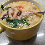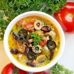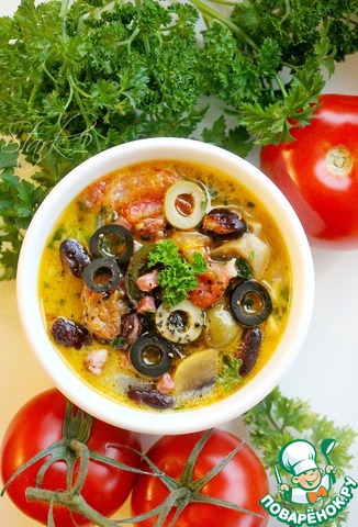 Минут через 5 добавили оливки, порезанные кружочками, зелень (можно в кастрюлю - можно в тарелки) и все. Разливаем, съедаем, принимаемся за новую порцию. Вышеупомянутый Алехо подавал к этой красоте крутоны - хлеб с чесноком, если хотите - приготовьте - белый хлебушек дольками свежий быстро обжариваем на оливковом масле, куда раздавленный чесночек добавлен, солим и вынимаем, чтоб масло лишнее не впитало. Очень вкусно. И очень сытно. Приятного вам аппетита и... ВИВА, Италия!