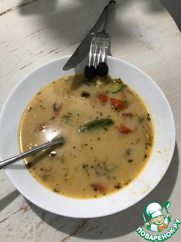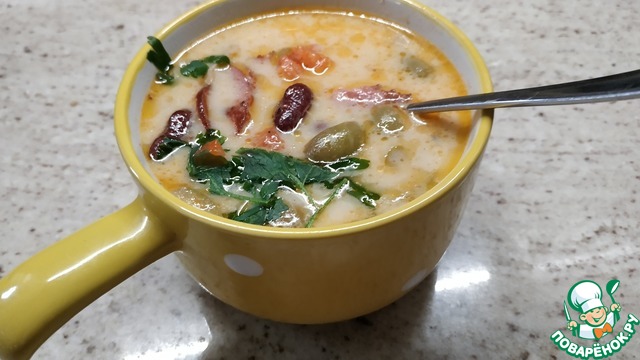 И приступаем к главному. Начинаем добавлять понемногу и размешивать плавленый сыр. Понемногу - потому что легче размешивать. Достигаем желаемой густоты. В оригинале - это густота очень жирных сливок или очень жидкой сметаны. Поймете, если будете готовить. Суп не должен быть жидким, оно должно больше походить на похлебку. Вот промежуточный итог.