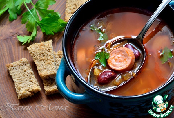 Рецепт этого супа был переписан давно из какого-то журнала. Немного изменен мною, в оригинале - томаты в собственном соку из банки, а колбаски копченые. Этот суп очень "прижился" в нашей семье, всем нравится его насыщенный вкус и аромат. Нередко его готовлю, советую попробовать!