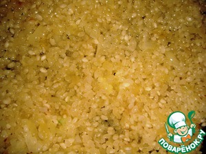 Далее нальем половину бульона и ни в коем случае не перемешиваем, ждем пока бульон впитается