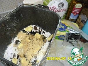 Заложить сначала жидкие ингредиенты в емкость хлебопечки с желтками, затем всыпать сухие ингредиенты. Дрожжи вложить в середину емкости.