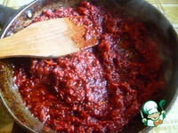Делаем зажарку. Сразу скажу, что у меня на фото уже готовая зажарка. Я ее осенью закрываю в банки. В ее составе: свекла, морковь, растительное масло и помидоры. Если у вас такого нет, то свеклу и морковь натереть на терке. Обжарить вместе с луком на растительном масле, добавить томатный сок и аджику, потушить до густоты, минут 10.
