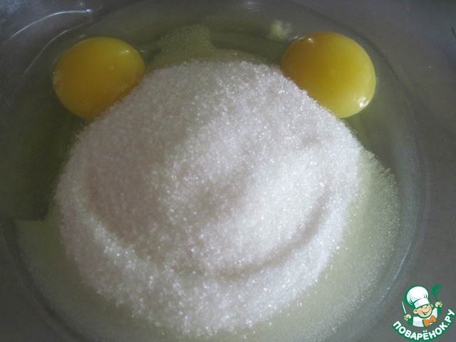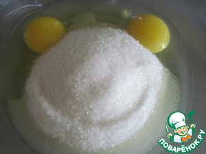 Соединяем яйца и сахар. Взбиваем в густую пену.