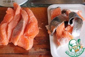 Стейк семги или лосося ополоснуть холодной водой, удалить косточку и кожу ( чешую можно не счищать).