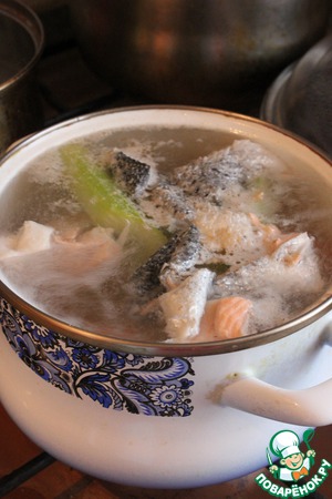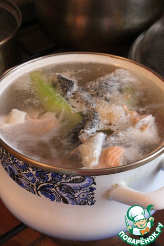 Рыбные кости и кожу отварить в 2 литрах воды с крупно порубленными сельдереем, морковью и половиной луковицы, добавить 100 мл белого вина. Варить 25 минут.