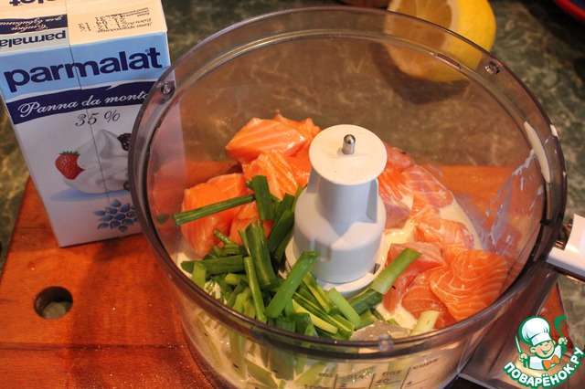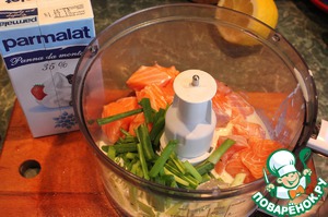 Рыбное филе сложить в комбайн добавить сливки, крупно рубленный зеленый лук, яичный белок, посолить и поперчить. Пробить в мелкий фарш, он не должен быть жидким или очень густым. Выложите мусс в кондитерский мешок.