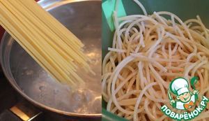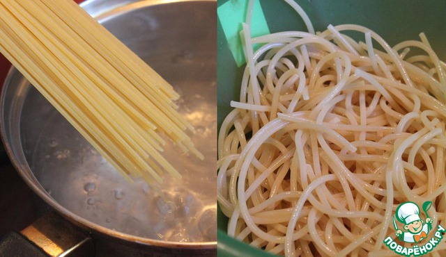 Спагетти отварить в подсоленной воде почти до готовности, откинуть на дуршлаг и ополоснуть холодной водой.