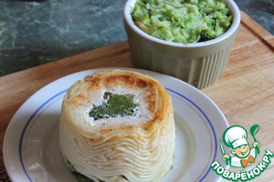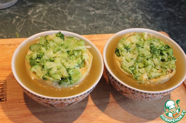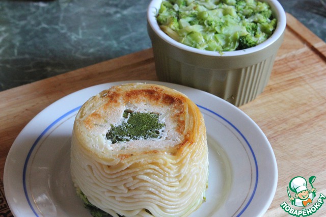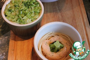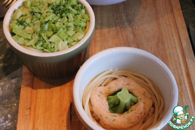 Огнеупорную форму смажьте сливочным масло и вдоль стенок уложите спагетти. В центр положите соцветие брокколи и мусс из семги. Сверху выложите порубленное брокколи. Формы накрыть фольгой и запекать в духовке 30 минут при 180 градусах. Я выпекала на режиме конвекции.