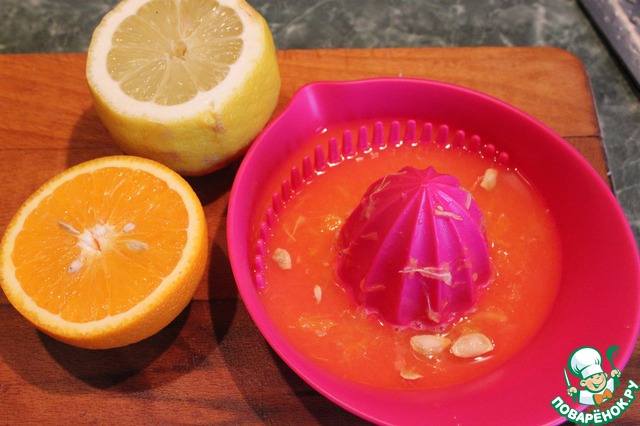 Из апельсина и половины лимона выжать сок. Кожуру апельсина не выбрасывать. Желатин замочить в вермуте.