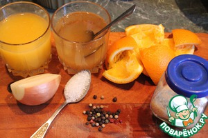 Пол литра, сваренного ранее рыбного бульона, вермут, апельсиново-лимонный сок вылить в сотейник и подогреть на медленном огне. Добавить остальную половину луковицы, кожура апельсина, перец горошком, 1 чайную ложку соли, 3 чайных ложки сахара. Не доводя до кипения, добавить разбухший желатин. Размешать до полного растворения желатина. Бульон процедить.