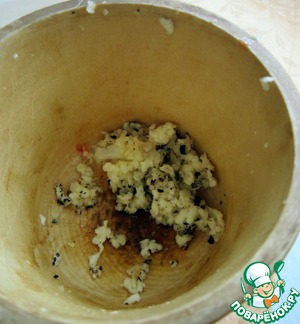 Перец растереть, чеснок через чеснокодавку, перемешать чеснок и перец.