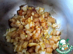 Шпик и лук порезать на мелкие кубики. Измельчить зелень петрушки. В кастрюлю налить оливковое масло, разогреть и обжарить овощи и шпик.