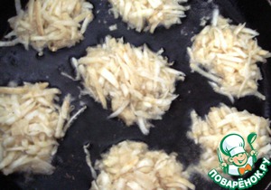 На разогретую сковороду с маслом выкладываем прямо ложкой: 1 ложка - 1 оладушек, жарим под крышкой
