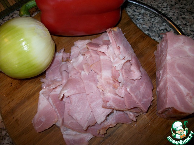Причем ветчину можно менять на окорок.креветки.моццарелу... В общем продукты вполне заменяемы на ваш вкус. Я бы перец убрала.для меня он тяжеловат,а добавила бы морковь и слайсы лимона