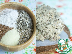 Приступим к лепешкам... Смешаем два вида муки, ржаные хлопья, семена льна и подсолнечника, добавим 1/3 ч. л. соли и 2 ч. л. меда. Вольем горячую воду - примерно 120 мл., замешаем не очень крутое тесто и дадим ему настояться минут 20. Сразу предупреждаю - тесто получается липким, нежным и легко рвется, так что работать с ним нужно очень аккуратно.