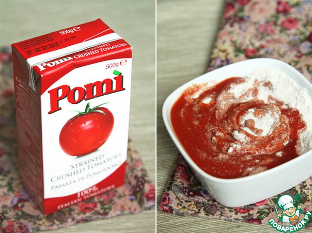 Для приготовления этих хлебцев возьмем протертые помидоры фирмы Pomi и смешаем с двумя видами муки и дрожжами.