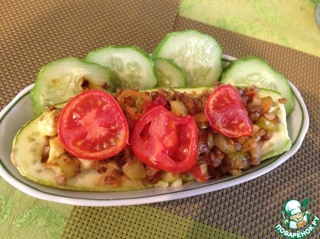 • Мелко порезанные лук, чеснок, мякоть овощей ( томатов, цуккини и перца) обжариваем вместе с грибами на маленьком огне. Добавим соль и сахар. Перемешиваем с гречкой и, наполнив овощные *тарелочки*, ставим их запекать в духовку на 20 минут. Готовые овощные запеканки посыпать зеленью и орехами.