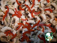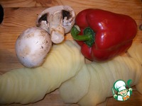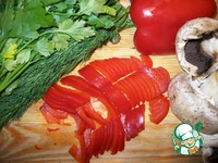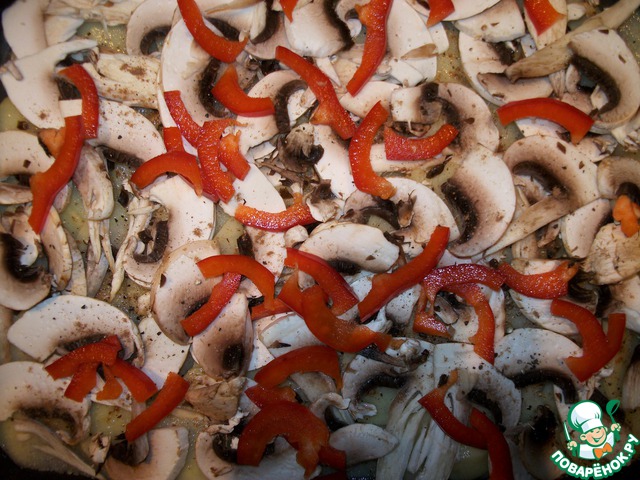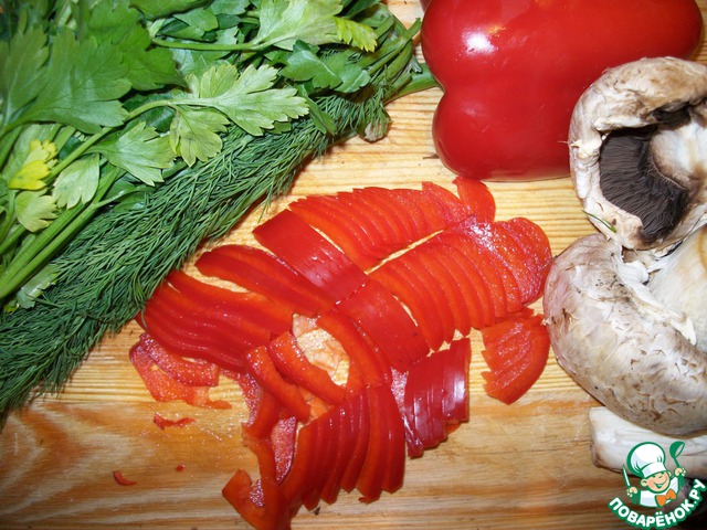 Теперь перчик режем длинными полосочками, потом поперек помельче, шампиньоны пластинками... |