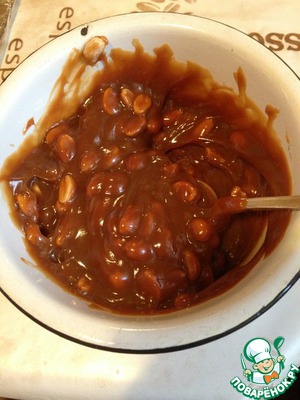 И начала обмазывать торт и склеивать блины) Орешки должны быть только в месте скрепления блинов, никак иначе)
