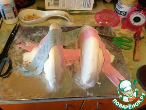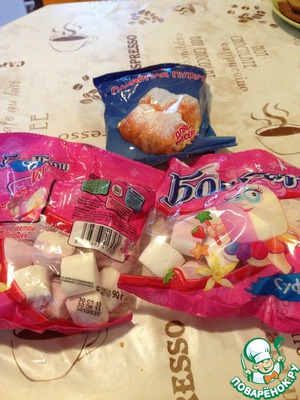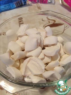 Я купила маршмеллоу двухцветные, поэтому пришлось ножницами разделять на белые и розовые.