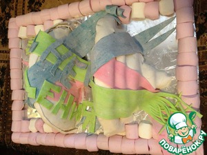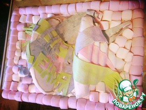 Оставшиеся зефирки выложила на поднос) И вуаля ) Штанга для Спортсмена готова). Мучилась с этим делом я 4 часа, не считая приготовления самого пирога.