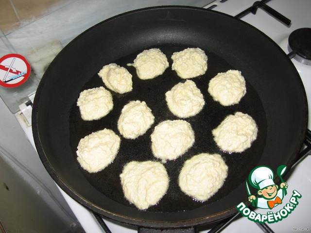 Столовой ложкой выкладывать на сковородку и жарить на растительном масле на небольшом огне.