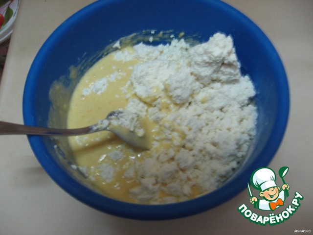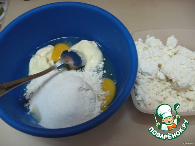 Смешать яйца, майонез, муку, сахар, ванильный сахар до однородной массы.
