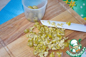 Порезать оливки.