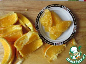 Апельсин вымыть, обсушить, разрезать на дольки и вырезать несколько долек без пленок.