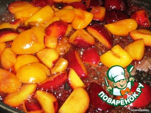 На сковородку положить сливочное масло, сахар, растопить до карамели и добавить мытые и нарезанные фрукты