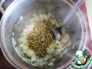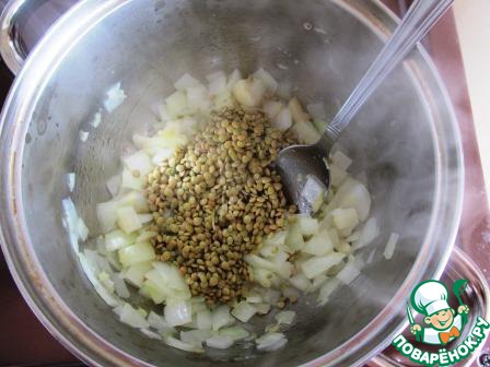 Всыпать чечевицу в кастрюлю, залить овощным бульоном или водой. Посолить, если используете воду. Я использовала приготовленный накануне овощной бульон.