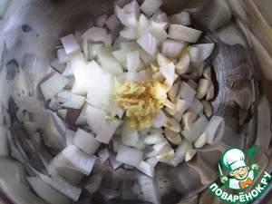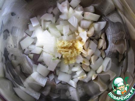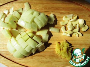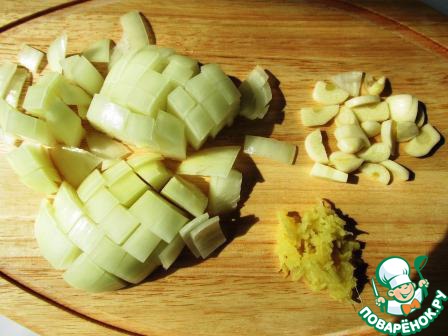 Лук нарезать произвольно, имбирь натереть на терке, свежий чеснок нарезать ломтиками.