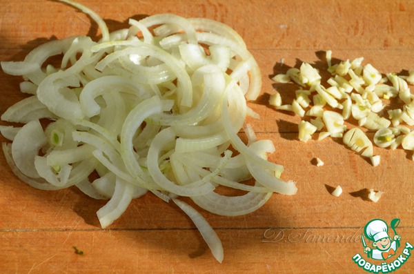 Лук нарезать полукольцами, чеснок мелко нарубить.