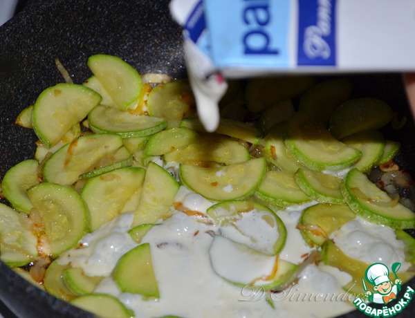 Обжарить на масле лук, чеснок и кабачки до мягкости.